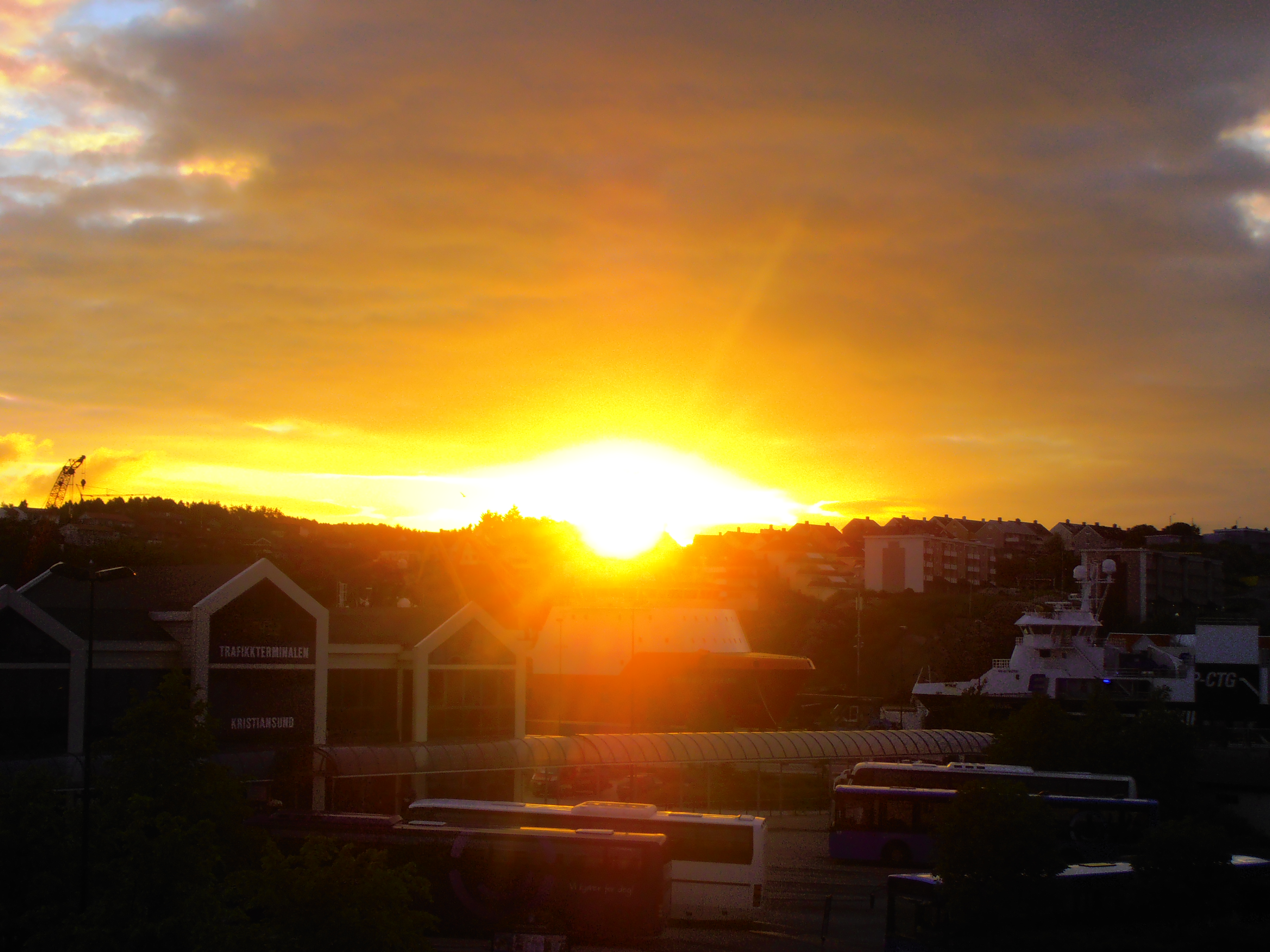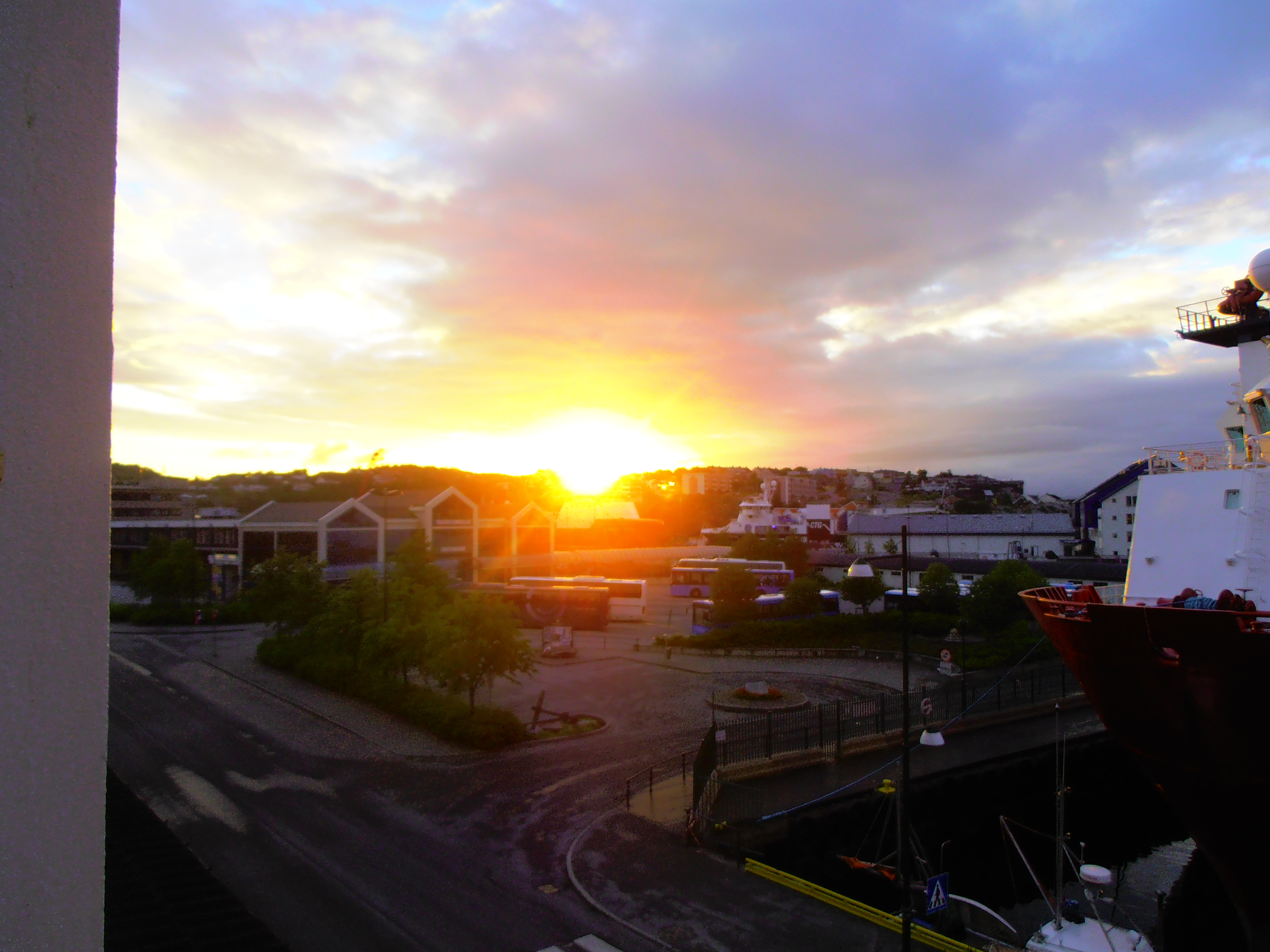 Early morning and the sun breaks through 04.52. Zoom the picture and you see the time on the bus terminal building.
