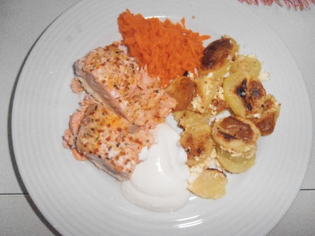 Det har blitt en stund siden jeg laget noe nytt på kjøkkenet mitt så tenkte prøve ut dette idag. Poteter lagt i rømme spedd med litt melk for at den ikke skulle bli for tørr. En smørklatt ble også lagt oppi og muskatnøtt strødd på toppen. Rømme og raspet gulerot til. Mmmmm nydelig godt 😀