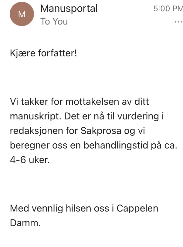 Jeg har undersøkt mer og det vil ta fra 3 til 8 uker etter å sendt til forlag før de gir tilbakemeldinger. Deretter ytterligere 6 til 8 uker til utgivelse. Jeg vet ikke om jeg trenger penger om forlag ønsker utgi den, tror det helst er om jeg må utgi boka selv. Uansett pengene som dere bidrar med på Spleisen skal gå til Stines Sofies Stiftelse tilslutt, for de gjør en viktig jobb for overgrepsutsatte barn og unge